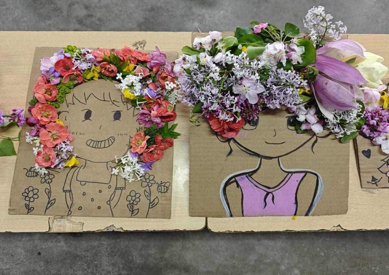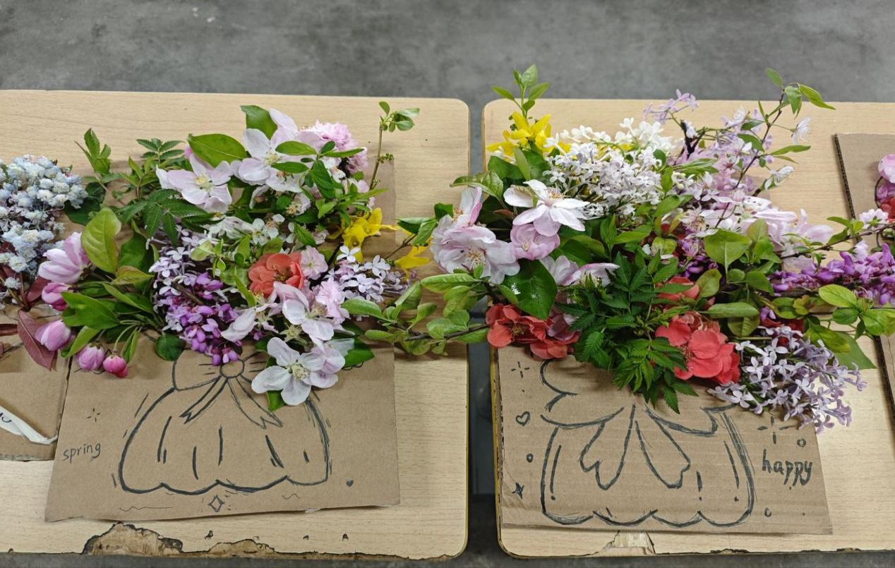 活动中,同学们深入校园采集海棠、丁香、迎春等应季花木,以专用纸板为基底,结合手绘创意精心创作。大家手持工具细致修剪,反复调整花的高低、疏密与色彩搭配,将春日灵秀与个人巧思融入作品。有的作品以淡雅粉白为主调,营造春日静谧氛围;有的作品巧用丝带与撞色搭配,尽显活泼创意,每一件作品都凝聚着同学们对生活美学的热爱与匠心。